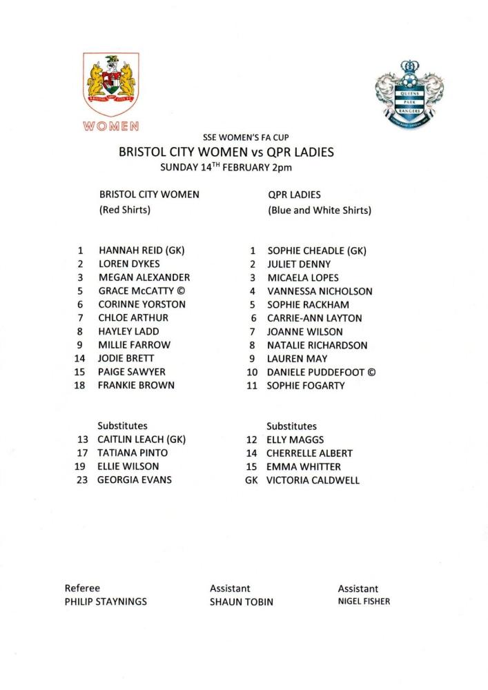 Bristol City Millie Farrow (2), Corrine Yorston, Chloe Arthur, Jodie Brett, Grace McCatty (c), Tatiana Pinto 7 (3) - (1) 1